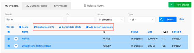 Users are now able consolidate multiple Bill of Materials of the same system type. Simply select multiple projects of the same system type from your list and click "Consolidate BOMs" to combine the Bill of Materials.