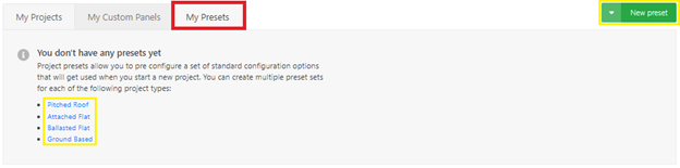 1) Head to your "My Projects" page and tab over to "My Presets". Once you're on this tab you can click on the "New preset" button or click on any of the system types linked in blue.