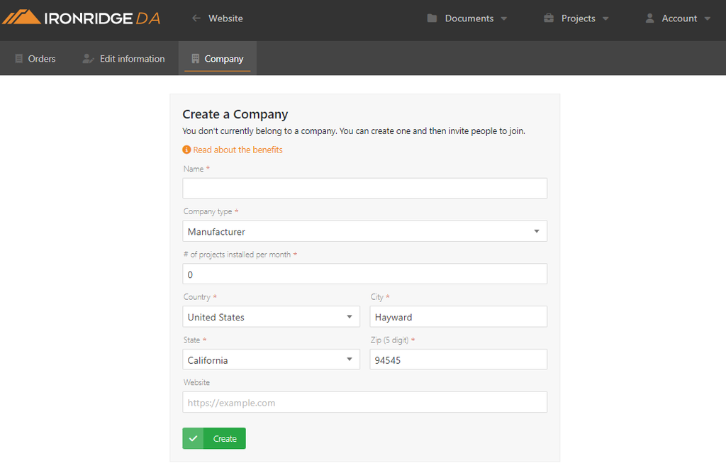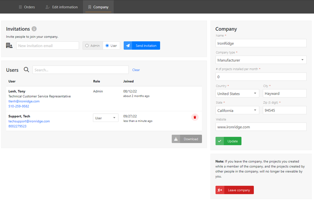 3. Once the company template has been filled out you will be redirected to the “Company” tab. Here you can invite users to join your company as either an admin or a regular user. Invitations will be sent via email. Once the users accepts the invitation, their information will be shown under the “Users” section indicating that they’re now a part of your company.