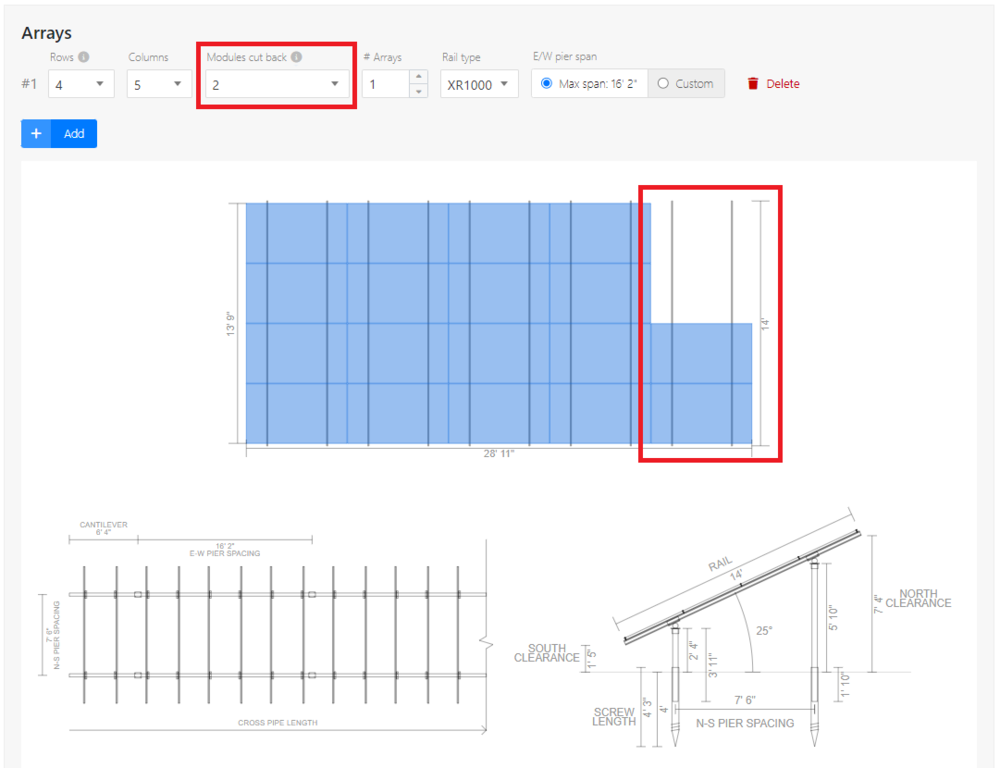 Ground based DA users now have a new top-down array view of their ground mount design. Along with the array drawing is a new feature that allows for removal of modules on the last column of their ground mount system.