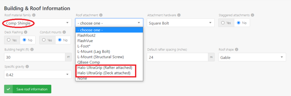 Additional fields have been added to the Pitched Roof Preset template to help speed up designing projects even more. This includes, but is not limited to, fields for roof material, roof attachment, and roof slopes. You can find these new fields under the "Building & Roof Information" section of the Design Assistant.