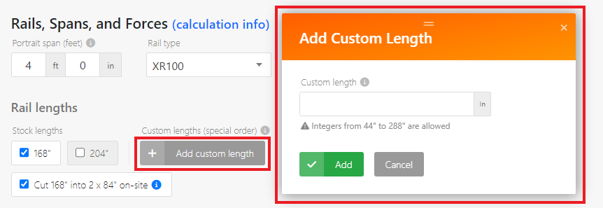 This feature is located under the "Rail, Spans, and Forces" section in the Pitched Roof and Flat Roof design assistants. Once you click on "Add custom length" button, a window will pop up allowing you to enter in the desired custom length.