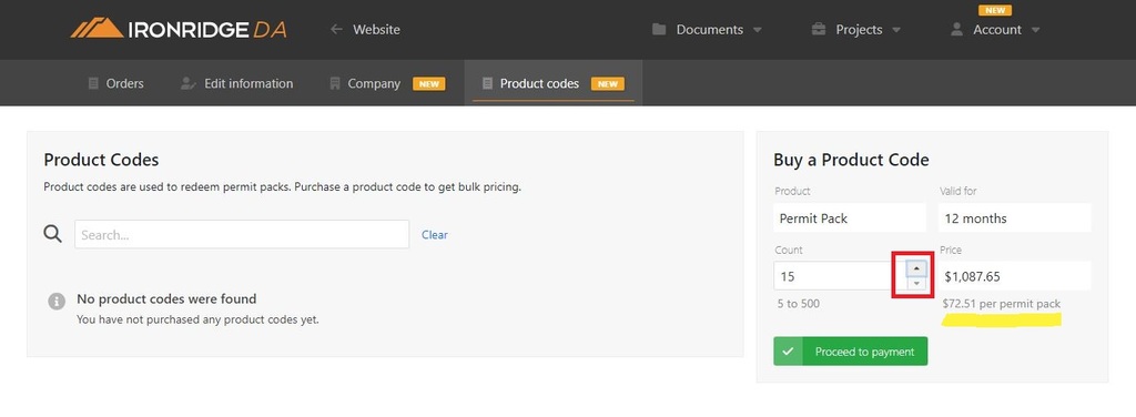 The ability to purchase permit packs in bulk will display on the right. As the quantity of permit packs are adjusted the cost per permit pack will be dynamically updated to follow.
