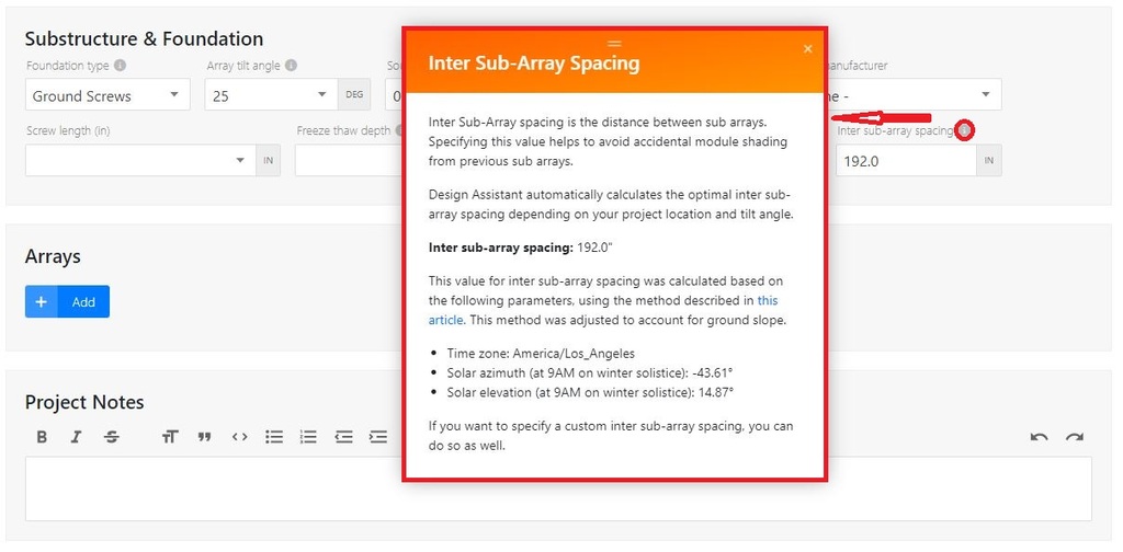 For the Ground Based Design Assistant, DA now automatically calculates the optimal inter sub-array spacing depending on your project location and tilt angle. The values for inter sub-array spacing were calculated based on the following parameters, using the method described in this article.