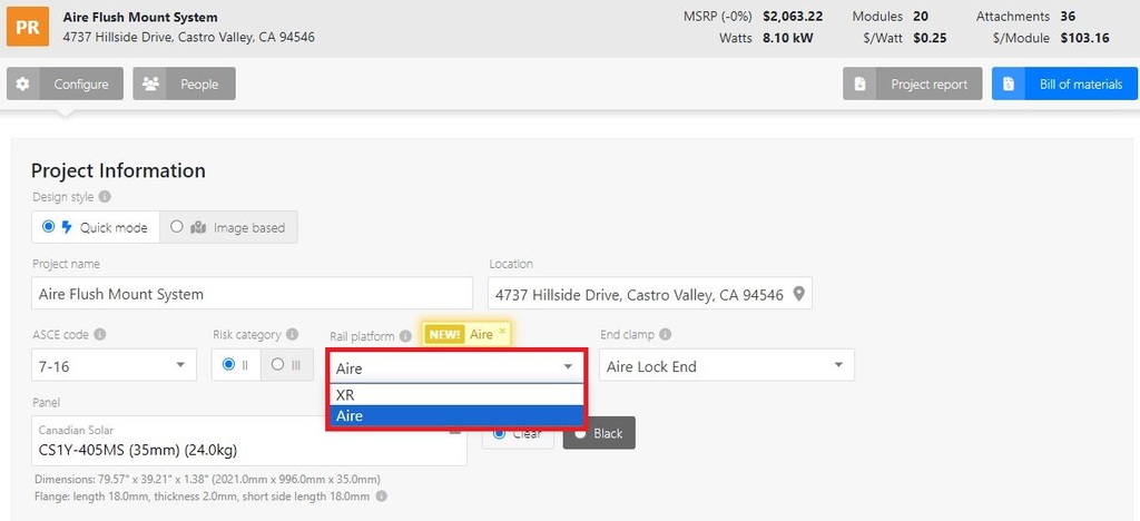 To use this new Flush Mount racking system, select "Aire" under the "Rail Platform" drop down menu in the project information section.
