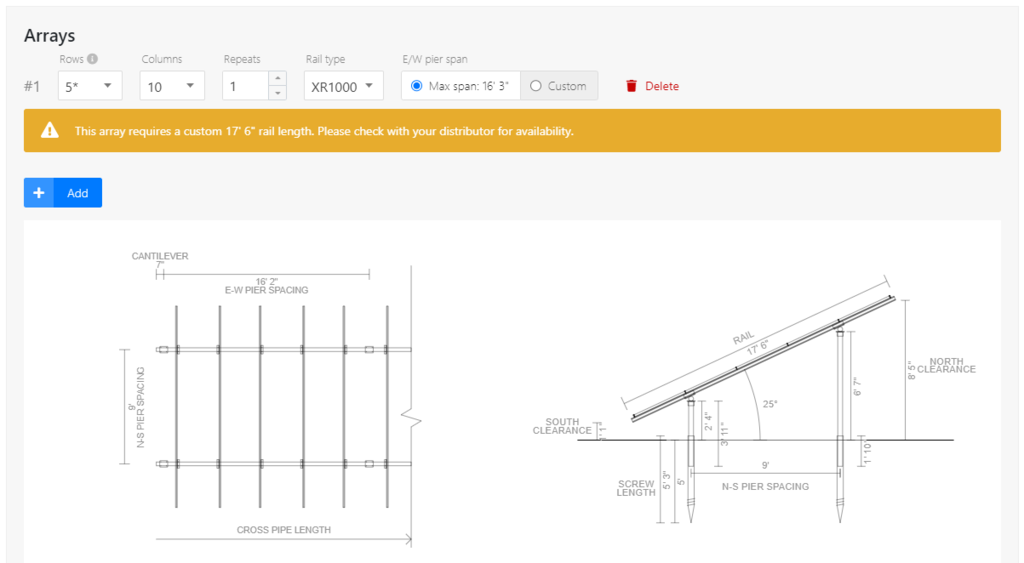 Users will now have the ability to design ground based arrays with larger module widths. Design assistant will automatically determine whether the longer custom 17' 6" rail is required. This will be represented in the "Rows" dropdown menu with an asterisk value and warning message (See example below).